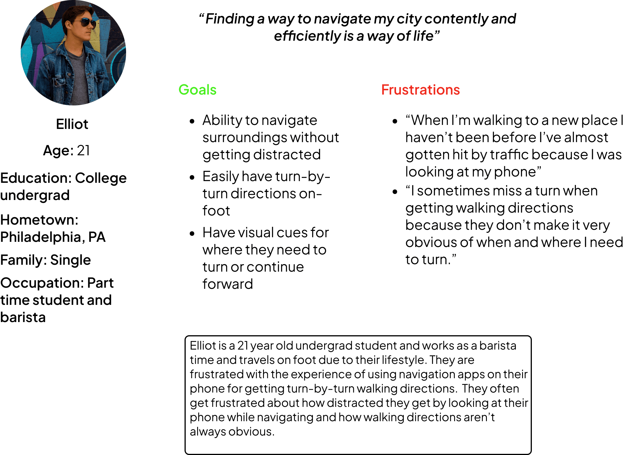 Problem Statement: Eliot is a 21 year old part time student a barista. They rely off their phone to navigate their community, especially since they live in an urban environment. They mostly commute on foot and rarely drives.