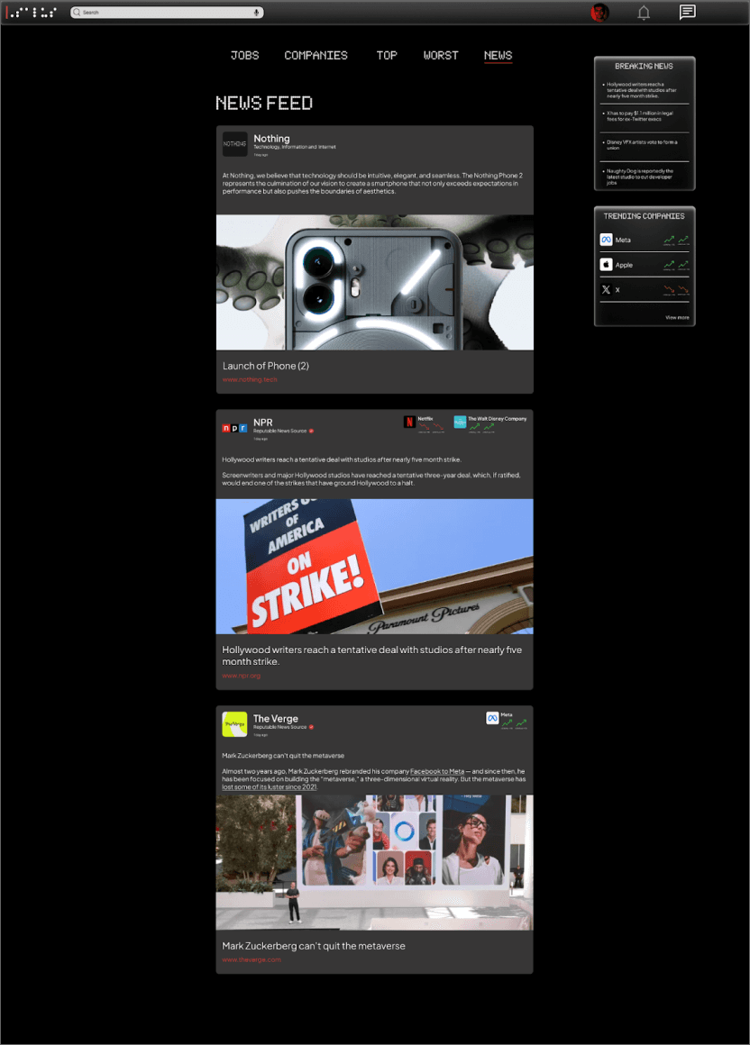 Mockups: Based on the insights from the usability study, I made changes to improve the sites clarity and transparency. One of the changes I made was adding relevant company ratings to articles in the news section. This allowed users to be more knowledgeable about what was going on with particular companies they might think about applying for. I also added headlines along with the accompany link to prevent misleading descriptions.