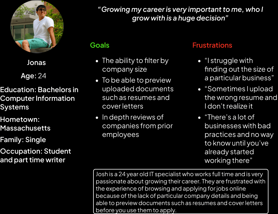 Problem Statement: Josh is a 24 year old IT specialist and recent graduate who lives with their partner. They work during the day and get off in the evening, and they occasionally browse through job listings online when they are available.