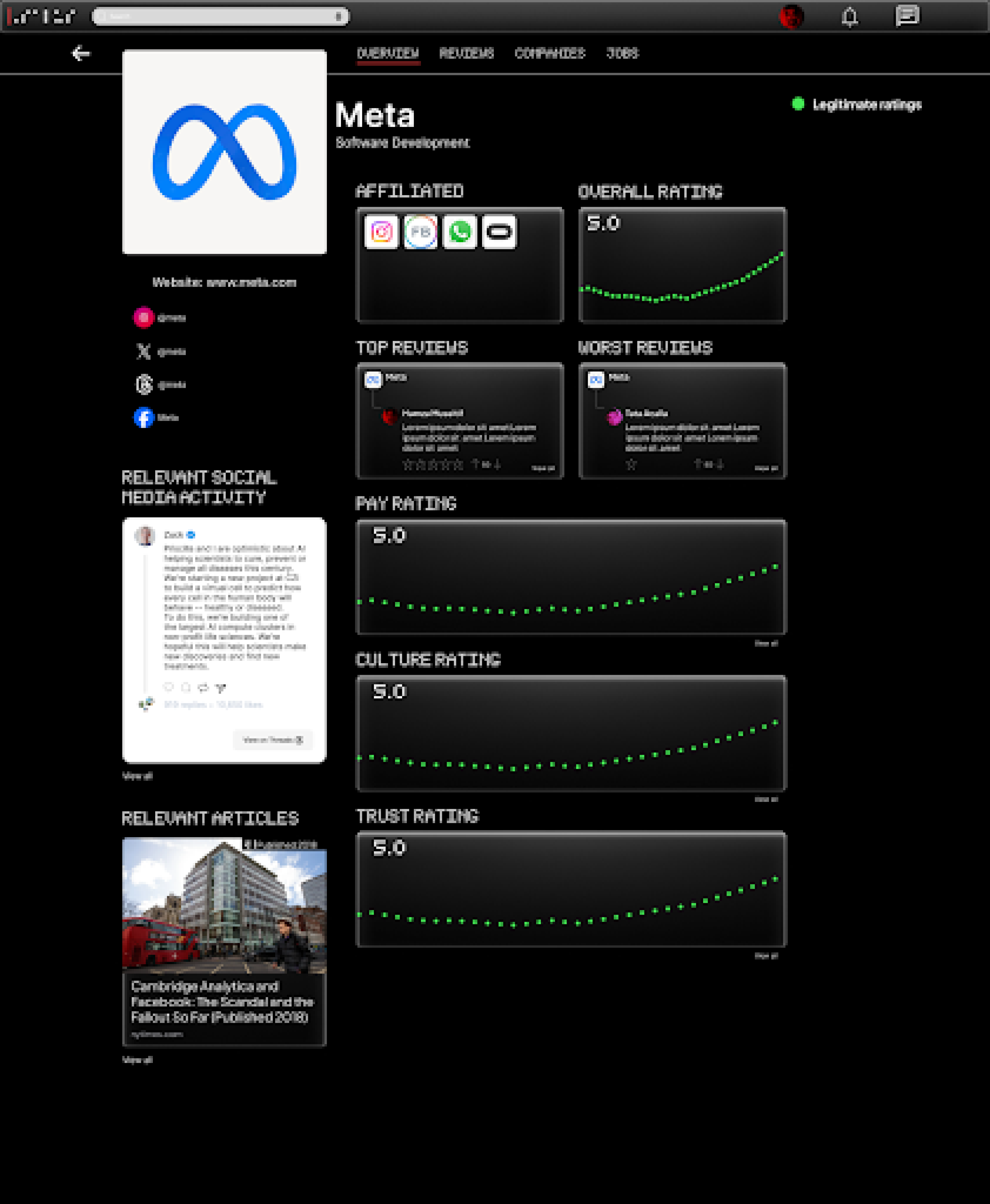 To make company ratings more readable, I decided to color code ratings based if they’re considered positive, moderate, or negative. Ratings charts are also scaled back to use only a single line chart instead of multiple. I also added a relevant social media presence from accounts that are associated with the said company. Relevant news articles regarding the company was also added to provide additional transparency for users.