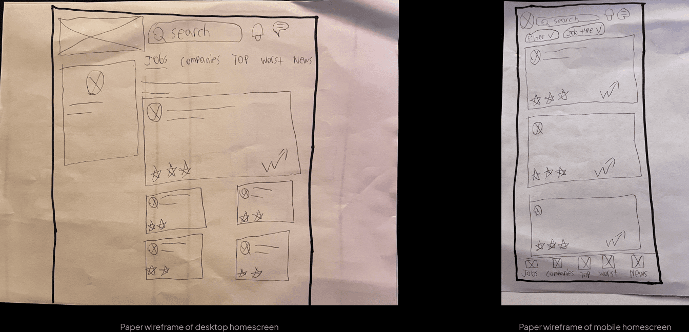 PaperWireframes: Next, I sketched out paper wireframes for each screen in my site, keeping the user pain points about navigation, browsing, applying in mind. The home screen paper wireframe variations bellow focus on optimizing the browsing experience for users