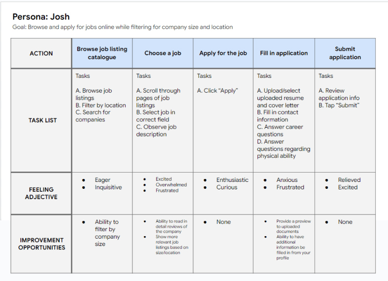 Mapping Josh’s user journey revealed how helpful it would be to show a user reviews of a company before applying. This would cause the user to be more confident in applying and feel more at ease.